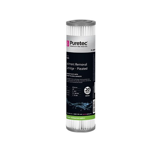 The Puretec PL201 sediment cartridge is manufactured from a durable non-woven and reusable polyester fabric that is suitable for a wide range of filtration uses. The media is pleated around a polypropylene core for added strength and the ends are immersed in a thermo-setting vinyl plastisol. Embedding and sealing each end of the pleat in this fashion fuses the three components together forming a unitized end cap and gasket. The overlap seam is sonically welded to reduce internal bypass improving filtration efficiency. The media is pleated to maximize dirt holding capacity and extend the time period between changes or cleaning. The Puretec PL201 sediment cartridge is resistant to both bacteria and chemical attack making them suitable for a variety of residential, commercial and industrial applications.