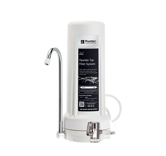 Counter Top System with GC051 Cartridge The Puretec CT Series counter top combined with its slimline design and portability offers a very convenient system for premium quality drinking water. The CT15 reduces chlorine, taste, odour, chemicals and sediment leaving vital minerals for maintaining a healthy life. Enjoy your own clean, beautiful tasting water from this simple and effective system. FEATURES & BENEFITS • Convenient portability provided through flexible hose. • Quick and simple connection to tap for portability. • Valve diverts from unfiltered to filtered water. • Compact, durable, economical design.